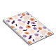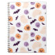 This design features a playful and colourful Halloween pattern with a minimalist design. The pattern includes simple, rounded shapes of jack-o'-lanterns, ghosts, skulls, and bats, all scattered across a white background. The colour palette is soft yet vibrant, with pumpkins in shades of orange, ghosts in pale peach, skulls in lavender, and bats in deep purple. Each element has a cute and friendly expression, making the pattern fun and lighthearted, perfect for Halloween decorations or kids' party themes. The overall design is cheerful and festive, capturing the whimsical side of Halloween.
