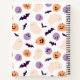 This design features a playful and colourful Halloween pattern with a minimalist design. The pattern includes simple, rounded shapes of jack-o'-lanterns, ghosts, skulls, and bats, all scattered across a white background. The colour palette is soft yet vibrant, with pumpkins in shades of orange, ghosts in pale peach, skulls in lavender, and bats in deep purple. Each element has a cute and friendly expression, making the pattern fun and lighthearted, perfect for Halloween decorations or kids' party themes. The overall design is cheerful and festive, capturing the whimsical side of Halloween.