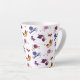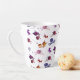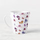 White latte mug with all around pattern of knitting needles, balls of yarn and cats pulling yarn. Gradient colours are maroon, blue, pink and golden brown. Choose either the small or tall latte mugs.