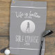 Trendy Life is Better on the Golf Course quotes design in classy ultimate grey and white is just for her! Design features a lady golfer silhouette in grey on a realistic looking golf ball. Personalise template with initials or name in classy white font and script. The background is solid grey and is set off with two small white stripes.