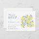 Add a joyful twist to your RSVP process with this Lemon Vines Wedding Response Card, designed to embody whimsy and sophistication in equal measure. A delicate pattern of lemon vines adorned with lively yellow fruits and cool blue leaves creates a vibrant, welcoming look that pops with modern charm and casual elegance. The minimal, soft layout keeps the focus on ease of response, blending playful illustration with clean lines and stylish typography for a fresh, trendy feel.