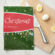 Add a touch of seasonal joy to your home with this festive custom Christmas kitchen towel. Towel features Santa Claus, Christmas lights, a green twinkling background, and a red ribbon. Personalise with your Merry Christmas greeting and family last name.