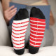 One sock features a red and white striped design with a "Wacky Reindeer" on the calf, while the other is white with red stripes and a different "Wacky Reindeer" - a delightfully mismatched pair that's sure to spark joy and laughter all season long.