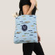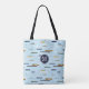 This unique boating themed monogrammed tote bag features a pattern of varied size seafaring vessels on a light blue background - the pattern includes 2 cargo ships, 2 sailing vessels, 2 antique-style wood boats, 1 fishing boat, a rowboat and a houseboat - close inspection of the pattern reveals people enjoying a day on the river - "A Day On the River" © katz_d_zynes 2020