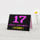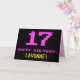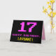 The front of this fun, nerdy, and geeky birthday themed greeting card design features a large pink number "17", along with the message "HAPPY BIRTHDAY," in pink, and a bold yellow customisable recipient name. The text features an appearance inspired by that of vintage 8-bit style video/computer game graphics from the 1970s and 1980s, and the background is coloured black. The inside features a customised birthday greeting message, or could perhaps be cleared and left blank if a message is to be written by hand instead. A silly customisable birthday card like this might be a fun way to send a message in celebration of somebody’s seventeenth birthday. [~Z0000478]