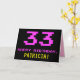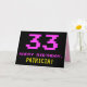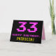 The front of this fun, nerdy, and geeky birthday themed greeting card design features a large number "33" and the message "HAPPY BIRTHDAY," colored pink, along with a bold yellow editable recipient name. The text has an appearance inspired by that of classic 8-bit style video game and computer game graphics from the 1970s and 1980s, and the background is colored black. The inside has a customized birthday greeting message, or could perhaps be cleared and left blank if a message is to be written by hand instead. A silly personalized birthday card like this might be a fun way to send a message in celebration of somebody’s thirty third birthday. [~Z0000478]