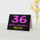 The front of this fun, nerdy, and geeky birthday-themed greeting card design features a large pink number "36", along with the message "HAPPY BIRTHDAY," in pink, and a bold yellow customizable recipient name. The text has an appearance inspired by that of classic 8-bit style video/computer game graphics from the 1970s and 1980s, and the background is colored black. The inside features a customizable birthday greeting message, or could perhaps be cleared and left blank if a message is to be written by hand instead. A silly customizable birthday card like this might be a fun way to send a message in celebration of somebody’s thirty-sixth birthday. [~Z0000478]