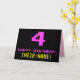 The front of this fun, geeky, and nerdy birthday-themed greeting card design features a large number "4" and the message "HAPPY BIRTHDAY," colored pink, along with a bold yellow customizable recipient name. The text has a look inspired by that of retro 8-bit style video/computer game graphics from the 1970s and 1980s, and the background is colored black. The inside features a personalized birthday greeting message, or could perhaps be cleared and left blank if a message is to be written by hand instead. A silly personalized birthday card like this might be a fun way to send a message celebrating somebody’s fourth birthday. [~Z0000478]