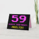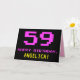 The front of this fun, geeky, and nerdy birthday themed greeting card design features a large pink number "59", along with the message "HAPPY BIRTHDAY," in pink, and a bold yellow custom recipient name. The text features an appearance inspired by that of retro 8-bit style video game and computer game graphics from the 1970s and 1980s, and the background is coloured black. The inside features a customisable birthday greeting message, or could perhaps be cleared and left blank if a message is to be written by hand instead. A silly personalised birthday card like this might be a fun way to celebrate somebody’s fifty ninth birthday. [~Z0000478]