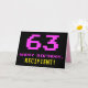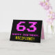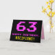 The front of this fun, nerdy, and geeky birthday-themed greeting card design features a large pink number "63", along with the message "HAPPY BIRTHDAY," in pink, and a bold yellow custom recipient name. The text features a look inspired by that of classic 8-bit style computer/video game graphics from the 1970s and 1980s, and the background is colored black. The inside has a customizable birthday greeting message, or could perhaps be cleared and left blank if a message is to be written by hand instead. A silly customizable birthday card like this might be a fun way of celebrating somebody’s sixty third birthday. [~Z0000478]
