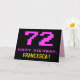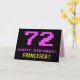 The front of this fun, geeky, and nerdy birthday greeting card design features a large number "72" and the message "HAPPY BIRTHDAY," colored pink, along with a bold yellow customizable recipient name. The text features a look inspired by that of vintage 8-bit style computer game and video game graphics from the 1970s and 1980s, and the background is colored black. The inside features a customizable birthday greeting message, or could perhaps be cleared and left blank if a message is to be written by hand instead. A silly customizable birthday card like this might be a fun way to send a message celebrating somebody’s seventy second birthday. [~Z0000478]