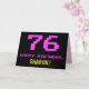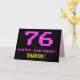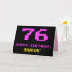 The front of this fun, nerdy, and geeky birthday themed greeting card design features a large number "76" and the message "HAPPY BIRTHDAY," colored pink, along with a bold yellow personalized recipient name. The text has a look inspired by that of classic 8-bit style computer game and video game graphics from the 1970s and 1980s, and the background is colored black. The inside has a custom birthday greeting message, or could perhaps be cleared and left blank if a message is to be written by hand instead. A silly customizable birthday card like this might be a fun way to celebrate somebody’s seventy-sixth birthday. [~Z0000478]