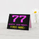 The front of this fun, nerdy, and geeky birthday-themed greeting card design features a large pink number "77", along with the message "HAPPY BIRTHDAY," in pink, and a bold yellow custom recipient name. The text has a look inspired by that of classic 8-bit style computer game and video game graphics from the 1970s and 1980s, and the background is coloured black. The inside has a customisable birthday greeting message, or could perhaps be cleared and left blank if a message is to be written by hand instead. A silly personalised birthday card like this might be a fun way of celebrating somebody’s seventy seventh birthday. [~Z0000478]