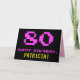 The front of this fun, nerdy, and geeky birthday greeting card design features a large pink number "80", along with the message "HAPPY BIRTHDAY," in pink, and a bold yellow customisable recipient name. The text has a look inspired by that of classic 8-bit style computer game and video game graphics from the 1970s and 1980s, and the background is coloured black. The inside has an editable birthday greeting message, or could perhaps be cleared and left blank if a message is to be written by hand instead. A silly personalised birthday card like this might be a fun way to send a message in celebration of somebody’s eightieth birthday. [~Z0000478]