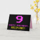 The front of this fun, geeky, and nerdy birthday greeting card design features a large pink number "9", along with the message "HAPPY BIRTHDAY," in pink, and a bold yellow customizable recipient name. The text has an appearance inspired by that of classic 8-bit style computer/video game graphics from the 1970s and 1980s, and the background is colored black. The inside has a personalized birthday greeting message, or could perhaps be cleared and left blank if a message is to be written by hand instead. A silly customizable birthday card like this might be a fun way of acknowledging somebody’s ninth birthday. [~Z0000478]