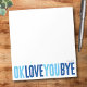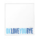 Add a sweet, personal touch to your notes with this fun, customisable notepad! Featuring the playful phrase "ok love you bye" in bold, alternating navy and sky blue, this notepad is perfect for leaving romantic little reminders. Choose from a variety of colours, backgrounds, and personalise with a name or phrase to make it uniquely yours. Whether you're looking for romantic gifts for your boyfriend or simply want a personalised notepad for yourself, this design is sure to bring a smile with every note!
