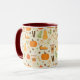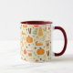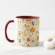 This design showcases a delightful fall-themed pattern filled with cosy autumn elements. The design includes illustrations of pumpkins, slices of pumpkin pie topped with whipped cream, warm fall beverages in to-go cups, and butternut squash. Scattered among these are cinnamon sticks, star anise, sprigs of greenery, autumn leaves, acorns, and small berries, all set against a soft cream background. The pattern exudes a warm and inviting atmosphere, perfect for celebrating the flavours and colours of the autumn season.