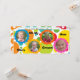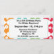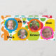 Fun Party birthday invitations with multicolored bright circles and flower patterns and areas you can easily customise with four photos and your party information!