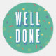 Celebrate achievements with this eye catching "Well Done" sticker, which features big, bold 3D-style text that stands out prominently. It is set against a playful confetti pattern made up of triangles, circles, spirals, and squiggles in bright, lively colors. The vibrant green background combined with modern typography makes this sticker an ideal choice for graduations, new homes, or any occasion deserving a stylish and energetic congratulation.