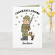 A simple military passing out greeting card featuring a cartoon image of a soldier with a dog and scattered stars, the word "congratulations", and the name of the soldier. The font styles, sizes and colours can be changed by clicking on the customise further link after personalising.
