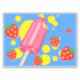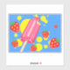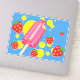 A vinyl decal with a summery theme. Designed with pink popsicle and some red strawberries tumbling around the popsicle along with some yellow paint splashes. Blue background.