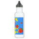 Water bottle with a summery theme. Designed with a pink popsicle and some red strawberries and yellow paint splashes. Blue background.