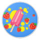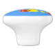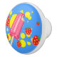 A ceramic knob with a summery theme. Designed with pink popsicle and some red strawberries tumbling around the popsicle along with some yellow paint splashes. Blue background.