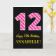 Fun Pink Striped "12"; Happy 12th Birthday; Name Card