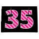 One side of this simple and fun birthday-themed gift bag design has a large number "35" featuring a dark pink and light pink stripes pattern. The other side features the birthday greeting message "Happy 35th Birthday," and a personalised name, both in yellow coloured text. The background is coloured black. Gift bags like this might be used when wrapping gifts or presents being given in honour of somebody’s thirty fifth birthday. [~Z0000378]