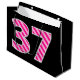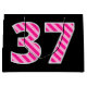 One side of this fun and simple birthday-themed giftbag design features a large number "37" with a dark pink and light pink stripes pattern. The birthday greeting message "Happy 37th Birthday," and a custom name appear on the other side, both in yellow coloured text. The background is coloured black. A gift bag like this might be used when wrapping presents or gifts being given in honour of somebody’s thirty seventh birthday. [~Z0000378]