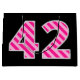 One side of this simple and fun birthday-themed gift bag design has a large number "42" featuring a dark pink and light pink stripes pattern. The birthday greeting message "Happy 42nd Birthday," and a customisable name appear on the other side, both in yellow coloured text. The background has a black colouring. A gift bag like this might be used when wrapping presents or gifts being given to somebody who is celebrating their forty second birthday. [~Z0000378]