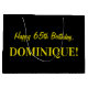 One side of this fun and simple birthday-themed gift bag design features a large number "65" with a dark pink and light pink stripes pattern. The birthday greeting message "Happy 65th Birthday," and a custom name appear on the other side, both in yellow coloured text. The background is coloured black. Gift bags like this might be used when wrapping presents or gifts being given to somebody who is celebrating their sixty fifth birthday. [~Z0000378]