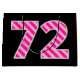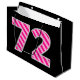 One side of this fun and simple birthday-themed gift bag design has a large number "72" featuring a dark pink and light pink stripes pattern. The birthday greeting message "Happy 72nd Birthday," and a customisable name appear on the other side, both in yellow coloured text. The background is coloured black. Gift bags like this might be used when wrapping presents or gifts being given in honour of somebody’s seventy second birthday. [~Z0000378]