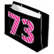One side of this fun and simple birthday-themed gift bag design features a large number "73" with a dark pink and light pink stripes pattern. The other side features the birthday greeting message "Happy 73rd Birthday," and an editable name, both in yellow coloured text. The background is coloured black. A gift bag like this might be used when wrapping presents or gifts being given to somebody who is celebrating their seventy third birthday. [~Z0000378]