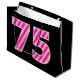 One side of this fun and simple birthday-themed gift bag design has a large number "75" featuring a dark pink and light pink stripes pattern. The other side has the birthday greeting message "Happy 75th Birthday," and a custom name, both in yellow coloured text. The background is coloured black. Gift bags like this might be used when wrapping presents or gifts being given to somebody who is celebrating their seventy fifth birthday. [~Z0000378]