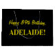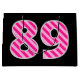 One side of this fun and simple birthday-themed gift bag design features a large number "89" with a dark pink and light pink stripes pattern. The birthday greeting message "Happy 89th Birthday," and a customisable name appear on the other side, both in yellow coloured text. The background is coloured black. Gift bags like this might be used when wrapping presents or gifts being given to celebrate somebody’s eighty ninth birthday. [~Z0000378]