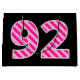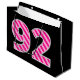 One side of this fun and simple birthday-themed giftbag design features a large number "92" with a dark pink and light pink stripes pattern. The other side has the birthday greeting message "Happy 92nd Birthday," and a customisable name, both in yellow coloured text. The background has a black colouring. A gift bag like this might be used when wrapping presents or gifts being given to somebody who is celebrating their ninety second birthday. [~Z0000378]