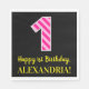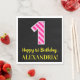 This fun birthday-themed paper napkin design features a large number "1" with a dark pink and light pink stripes pattern, along with the message "Happy 1st Birthday,", and a customisable name. The background is coloured black. Birthday themed paper napkins like this might be fun to use at a celebration being held to honour somebody who is celebrating their first birthday. [~Z0000380]