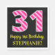 This fun birthday-themed paper napkin design features a large number "31" with a light pink and dark pink stripes pattern, along with the message "Happy 31st Birthday,", and a customisable name. The background is coloured black. Fun, customised paper napkins like this might be used at a celebration being held to honour somebody’s 31st birthday. [~Z0000380]