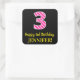 Fun Pink Stripes “3”: Happy 3rd Birthday + Name Square Sticker