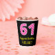 This joyful birthday-themed square sticker design features a large number “61”, with a light pink and dark pink stripes pattern. It also features the message “Happy 61st Birthday,”, plus a personalised name. The background is coloured black. Birthday themed paper cups like this might be fun to use at a birthday party being held for somebody who is celebrating their 61st birthday. [~Z0000580]