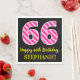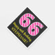 This fun birthday-themed paper napkin design features a large number "66" with a light pink and dark pink stripes pattern, along with the message "Happy 66th Birthday,", and an editable name. The background is coloured black. Birthday themed paper napkins like this might be used at a party celebrating somebody’s 66th birthday. [~Z0000380]