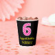 This joyful birthday-themed square sticker design features a large number “6”, with a light pink and dark pink stripes pattern. It also features the message “Happy 6th Birthday,”, plus a personalised name. The background is coloured black. Birthday themed paper cups like this might be a fun way to celebrate somebody’s sixth birthday. [~Z0000580]