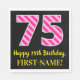 This fun birthday-themed paper napkin design features a large number "75" with a dark pink and light pink stripes pattern, along with the message "Happy 75th Birthday,", and a personalised name. The background is coloured black. Fun, editable paper napkins like this might be used at a celebration being held to honour somebody’s seventy fifth birthday. [~Z0000380]