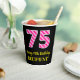 This joyful birthday-themed square sticker design features a large number “75” with a dark pink and light pink stripes pattern, along with the message “Happy 75th Birthday,”, and a custom name. The background is coloured black. Paper cups like this might be used at a birthday party for somebody who is celebrating their 75th birthday. [~Z0000580]