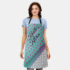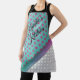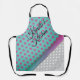 On this stylish apron is dark pink polka dots on a teal backdrop where you can personalise it to make it uniquely your own then a greenish purple ribbon diagonally placed then on the bottom is a grey and white polka-dot pattern. Fun retro vibes.