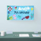 Banner for pool birthday party features swimming stuffs with water pool background.