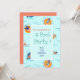 A modern fun party invitation for a pool party featuring a retro hip, cool graphic of swimmers and pool toys in bright and vibrant colours of orange and blue. The text on this invitation is fully customisable to include your own personal details.