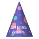 Playful purple party hats with a joyful scattering of colourful polka dots and the words Happy Birthday written in pink.