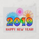 This fun 2019 New Year postcard design features the year number "2019" having a fun, vibrant, rainbow-like gradient pattern. It also features a colourful fireworks-like pattern, and the message "HAPPY NEW YEAR!". The message on the back can be customised. Postcards like this could perhaps be used to send New Year's Day greetings to friends and family.